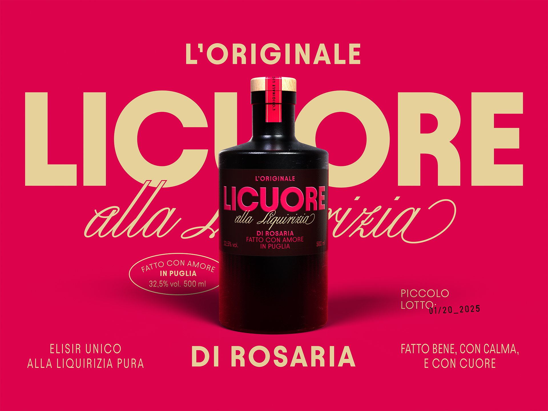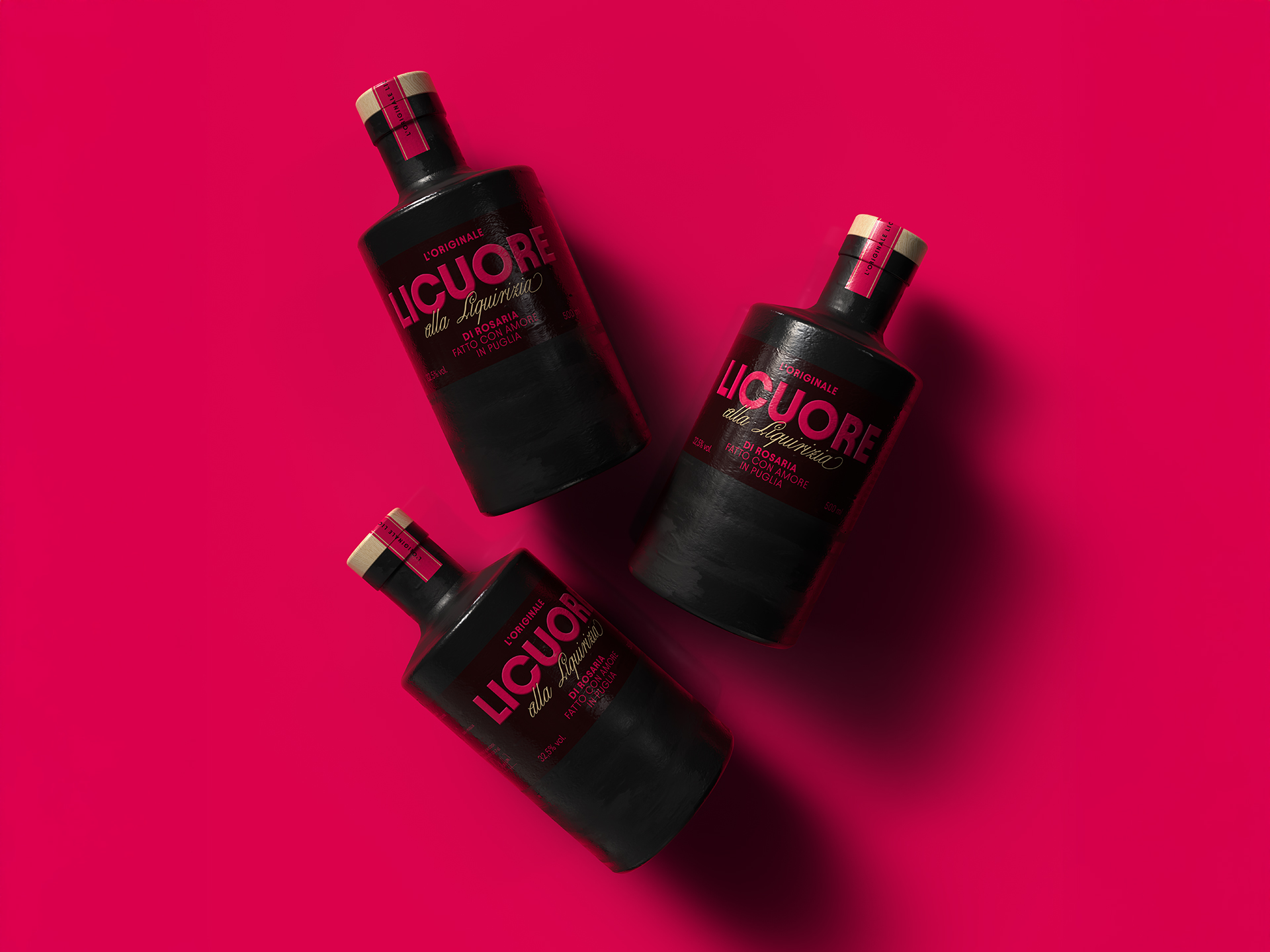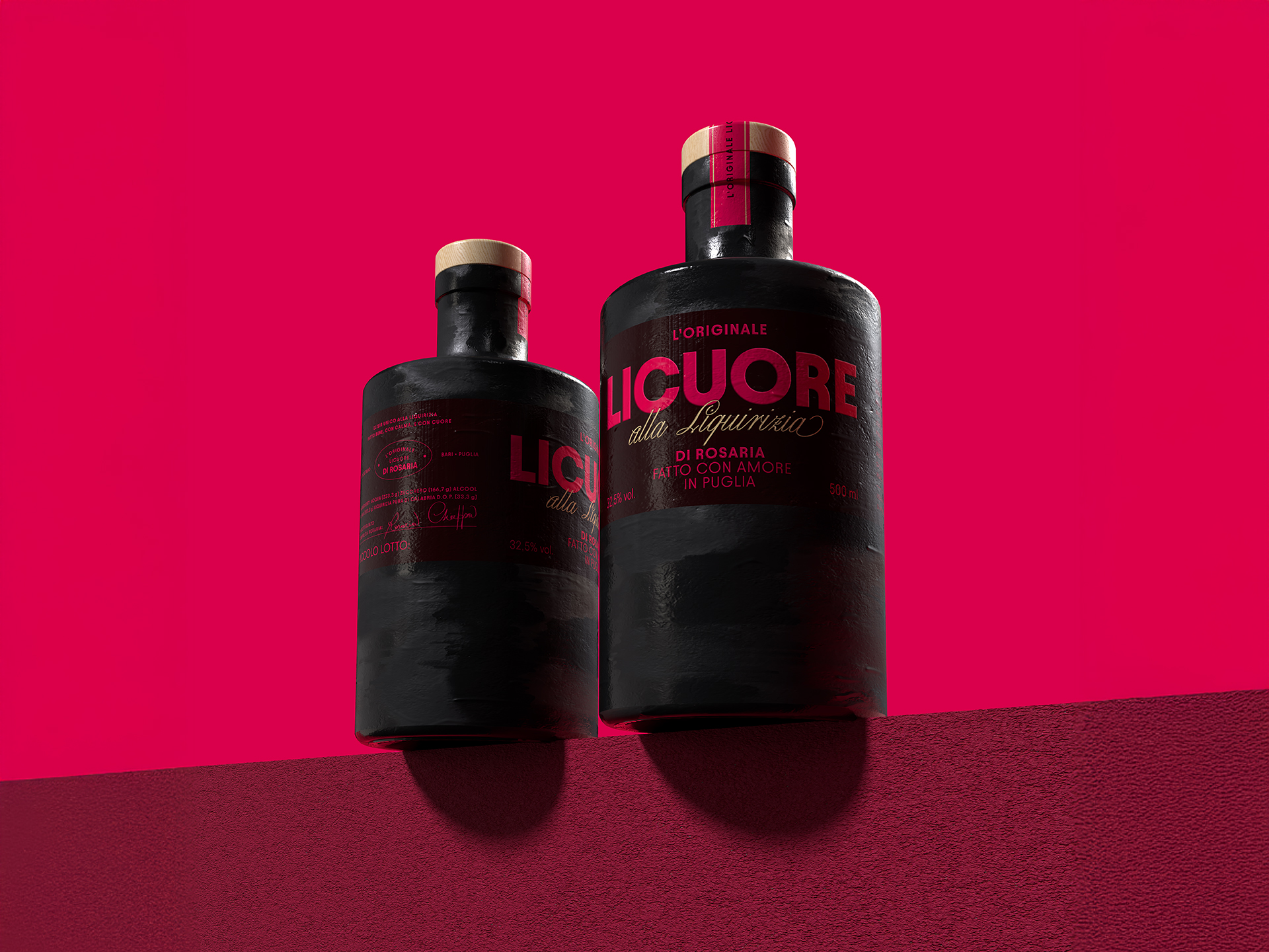 LICUORE reinterprets the visual language of traditional Apulian liqueurs with a contemporary touch: a deep black bottle contrasted by a vivid red — the color of passion, and of the love Rosaria pours into her homemade liquorice liqueur.