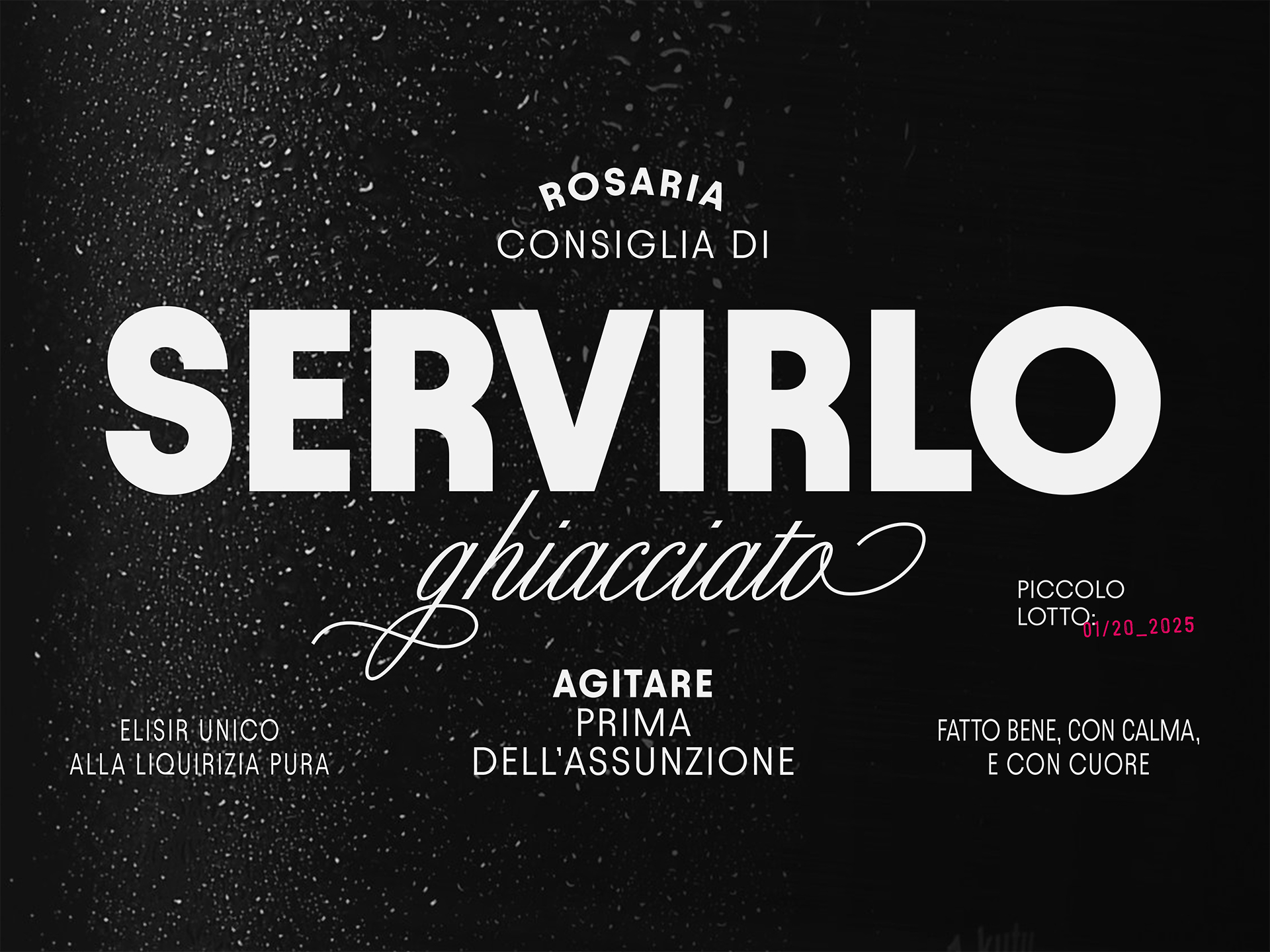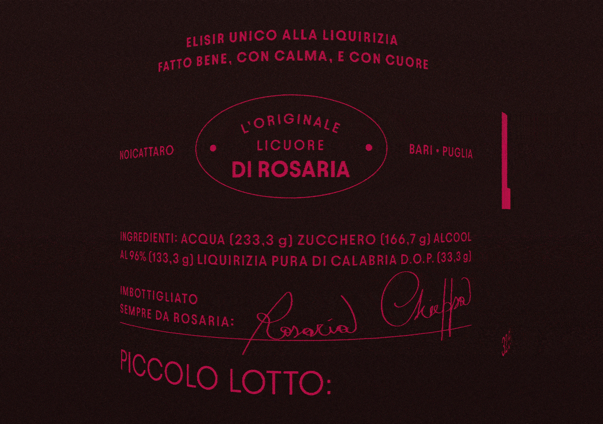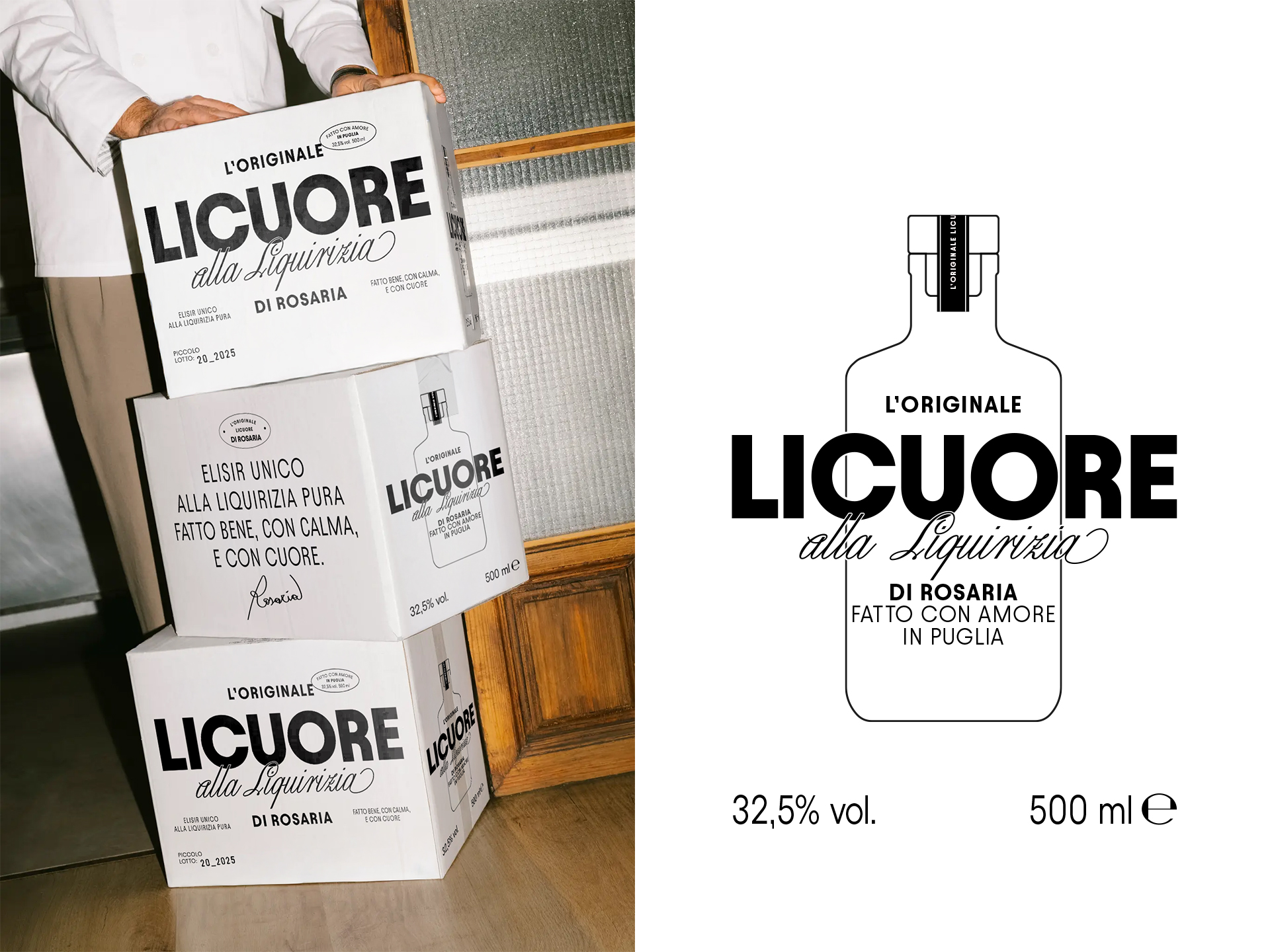 LICUORE reinterprets the visual language of traditional Apulian liqueurs with a contemporary touch: a deep black bottle contrasted by a vivid red — the color of passion, and of the love Rosaria pours into her homemade liquorice liqueur.